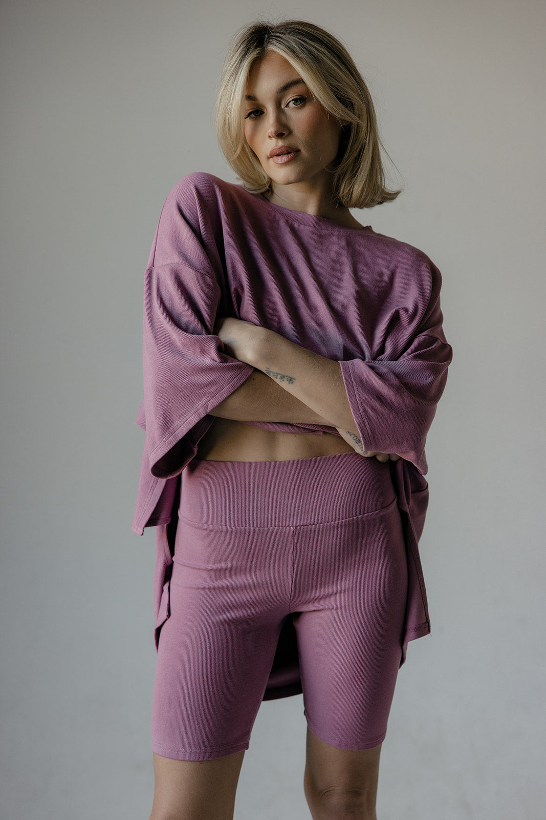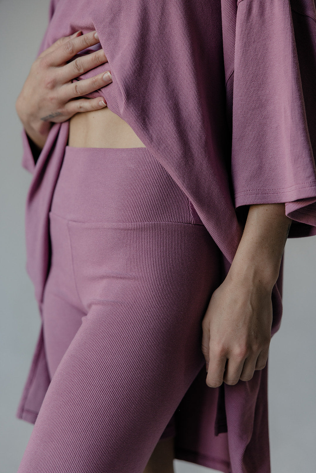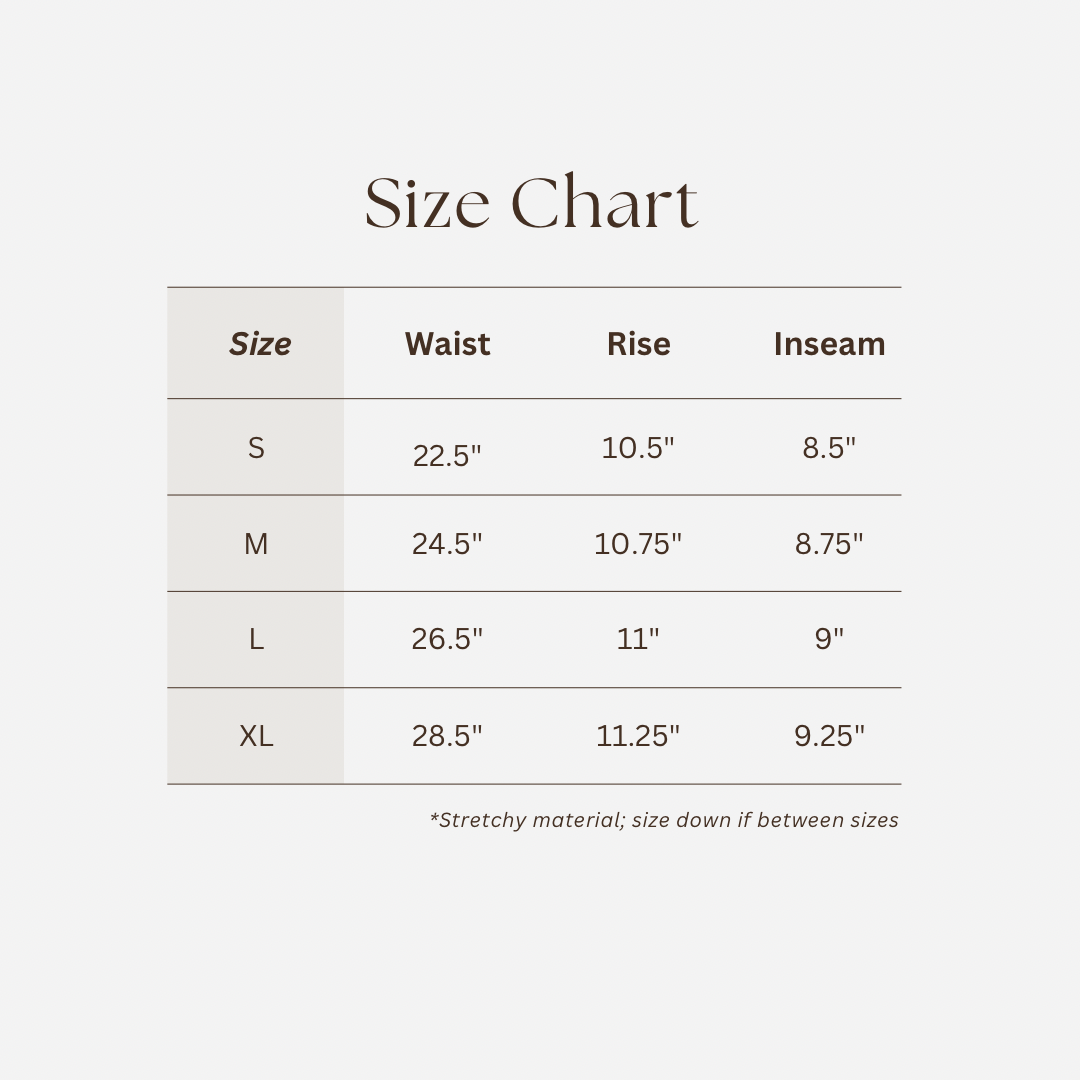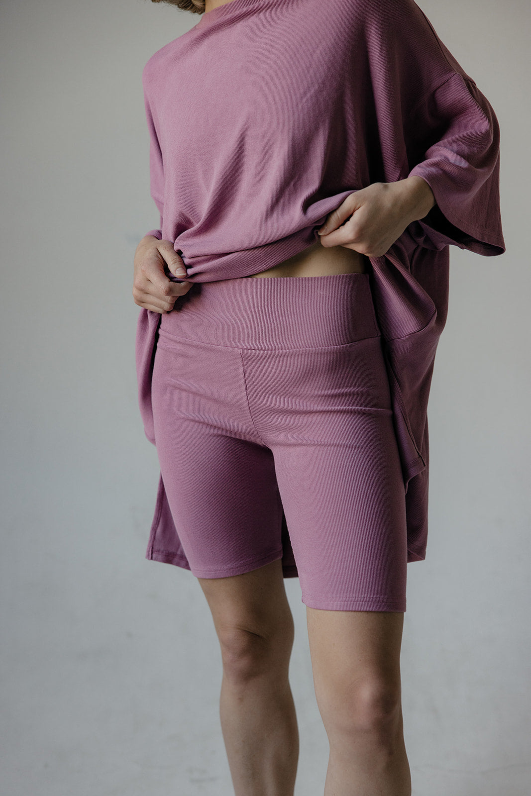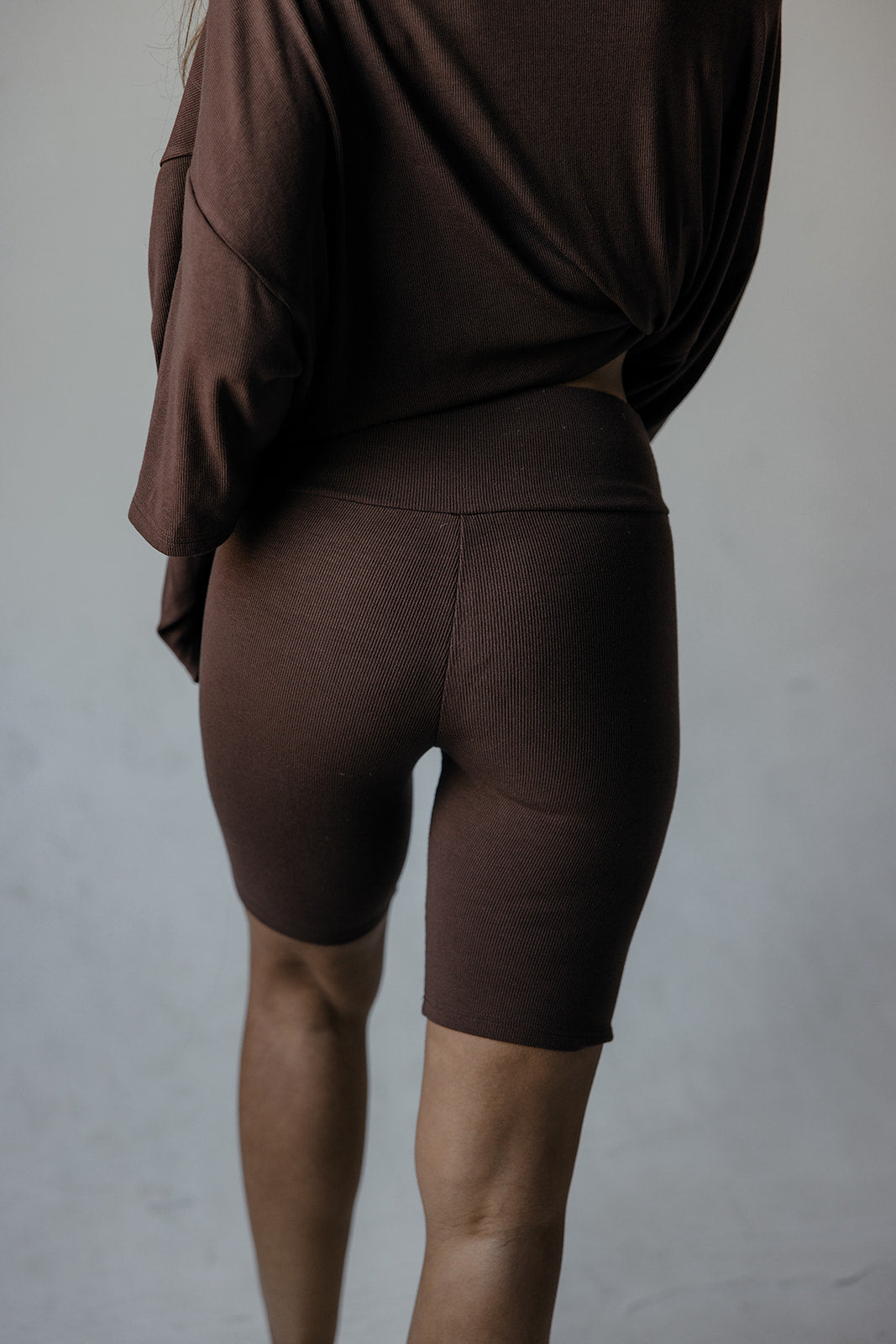 Soft ribbed biker shorts in a stretchy, comfortable fabric with an elastic waistband and mid-thigh length, featuring a high-rise fit for added support.