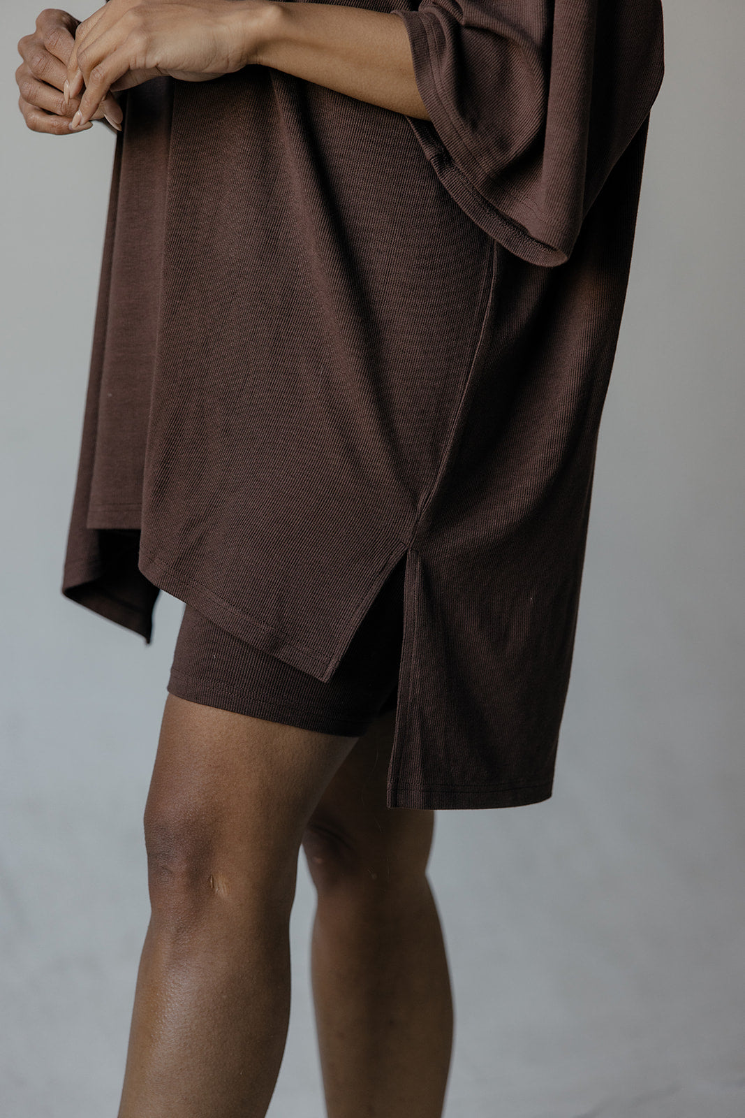 Oversized top in a soft, lightweight ribbed fabric, featuring elbow-length sleeves, side slits, and a relaxed fit. Banded hem for added structure.