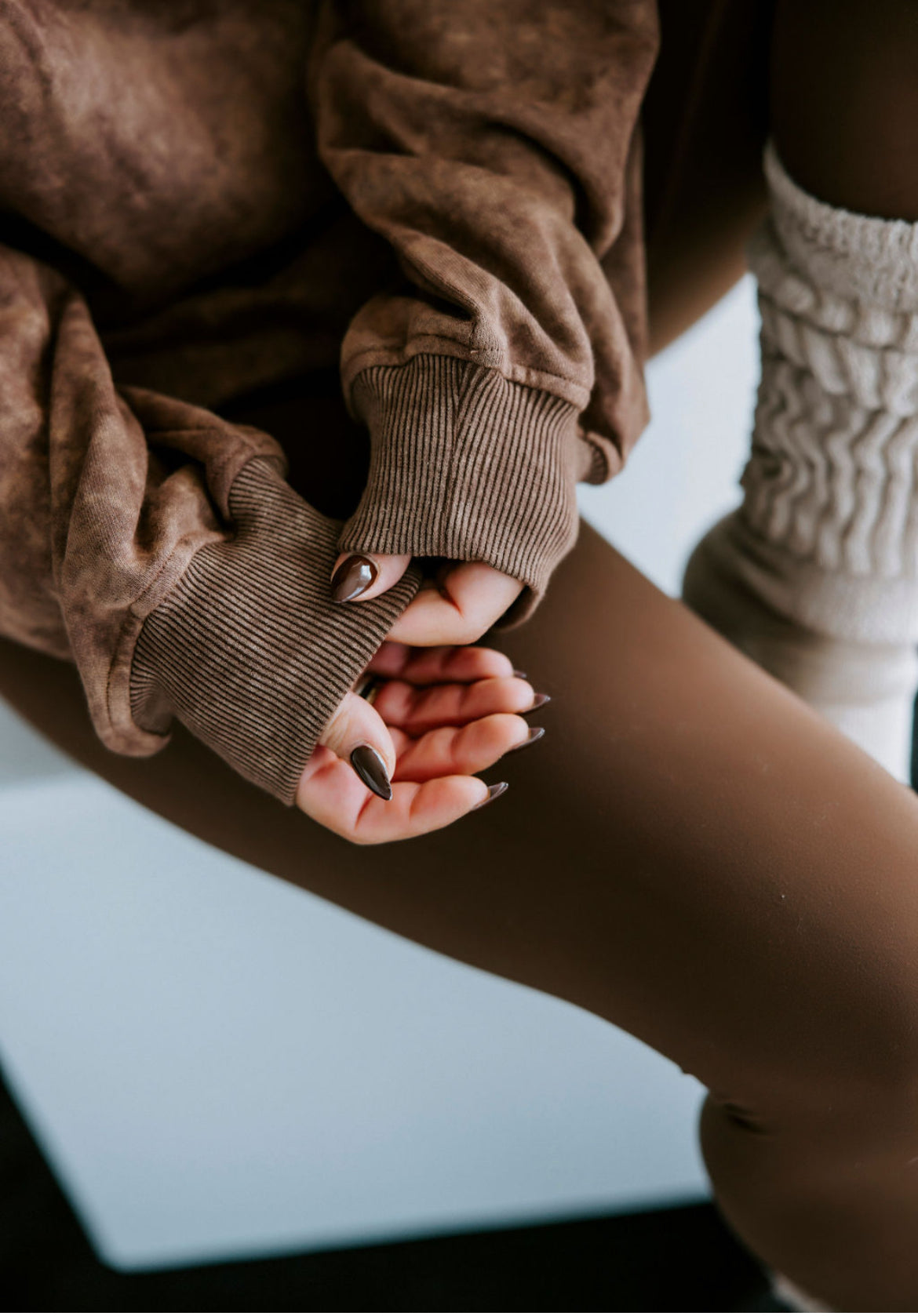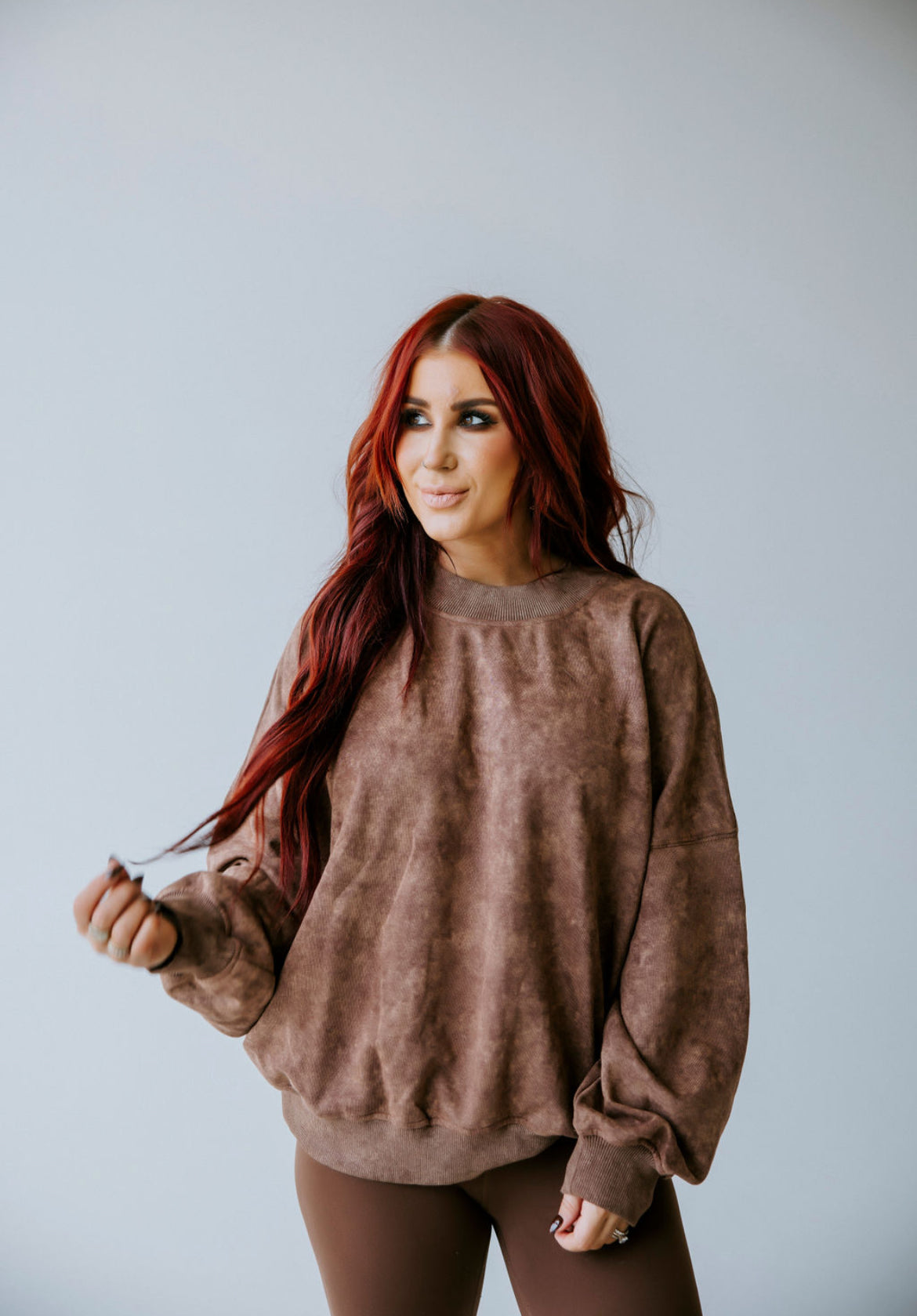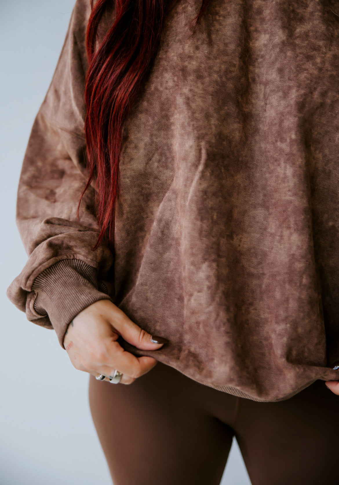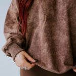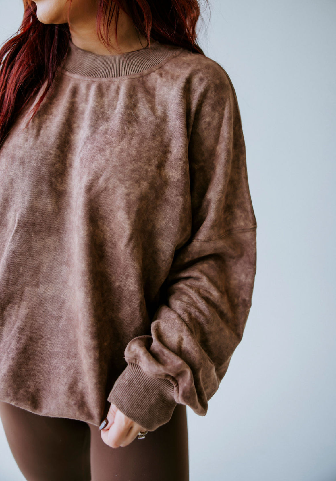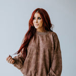 Oversized sweatshirt in a washed, textured fabric, featuring a relaxed fit and ribbed cuffs for added structure. Long sleeves with a slightly dropped shoulder design enhance the cozy feel, while the subtle color wash adds depth and dimension.