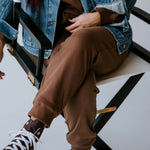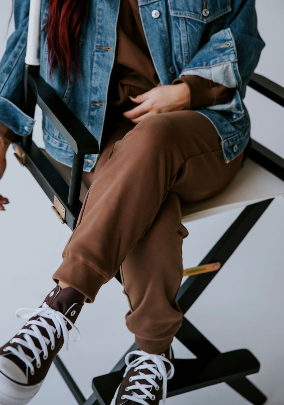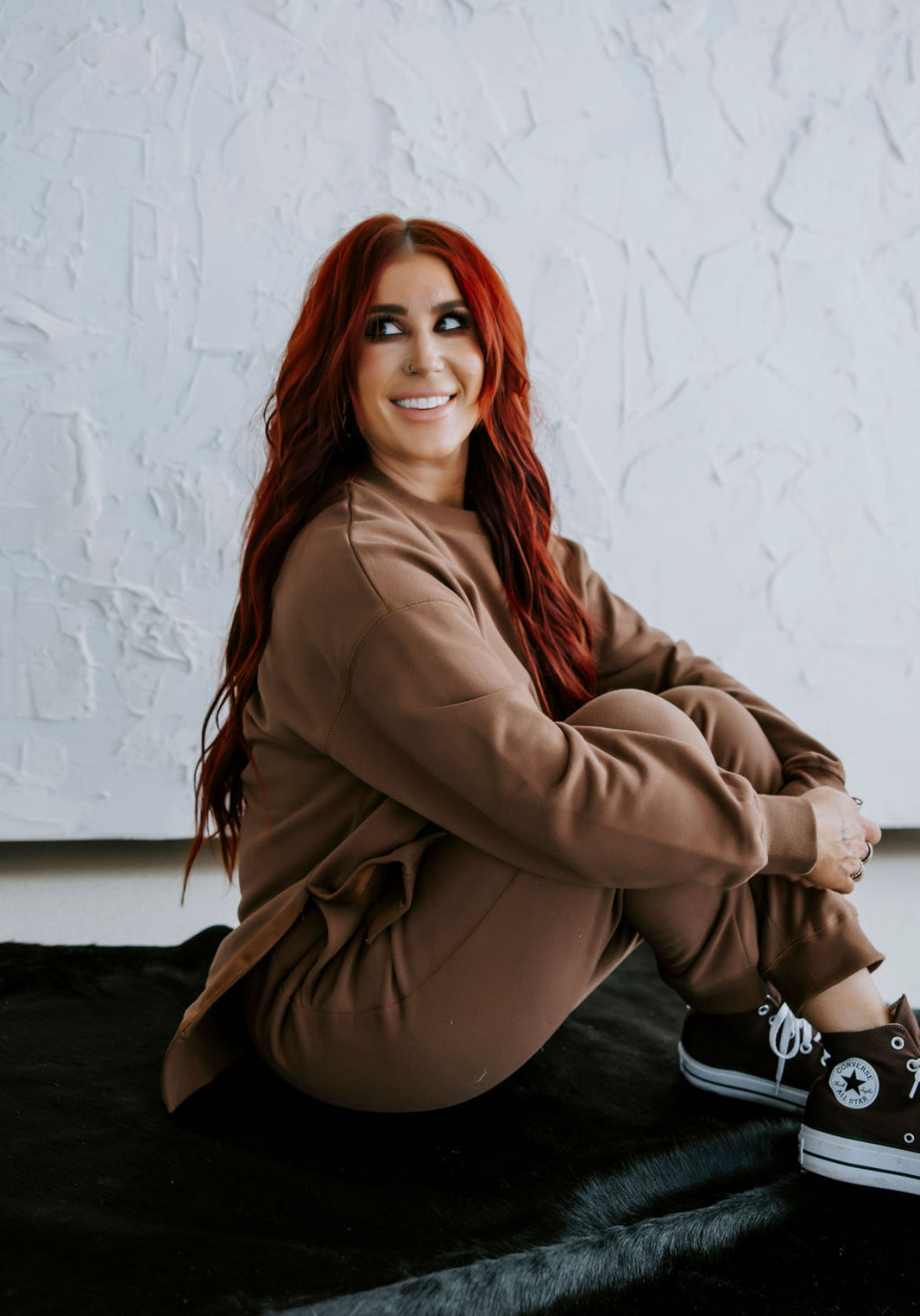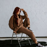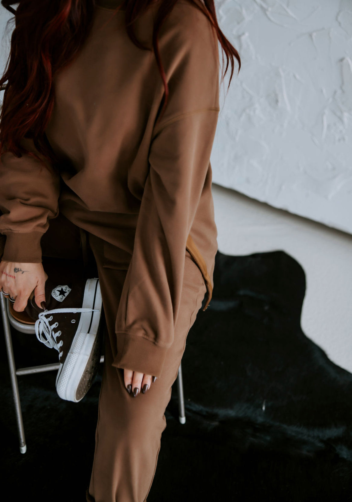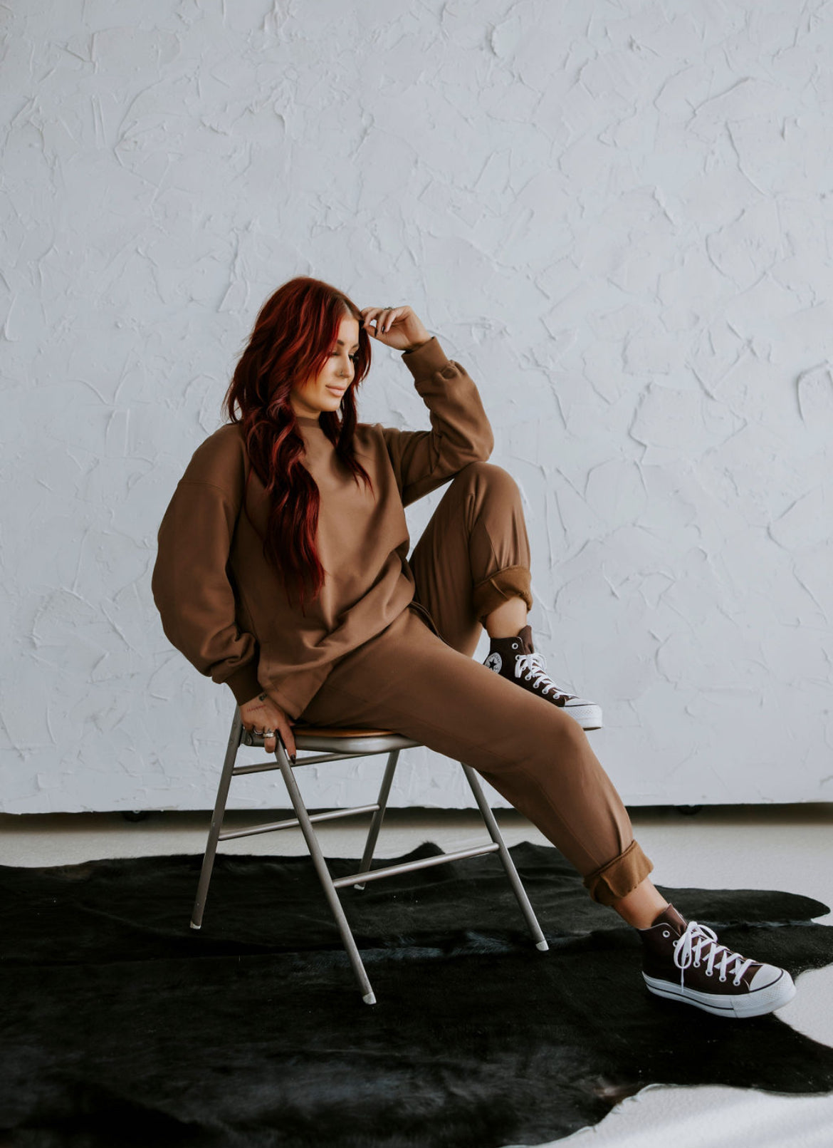 Relaxed-fit sweatshirt and jogger set in a soft, midweight fabric. The sweatshirt features a crew neckline and side slits for added movement, while the joggers have an elastic waistband and cuffed ankles for a comfortable, laid-back feel.