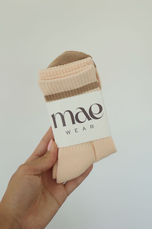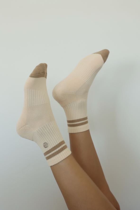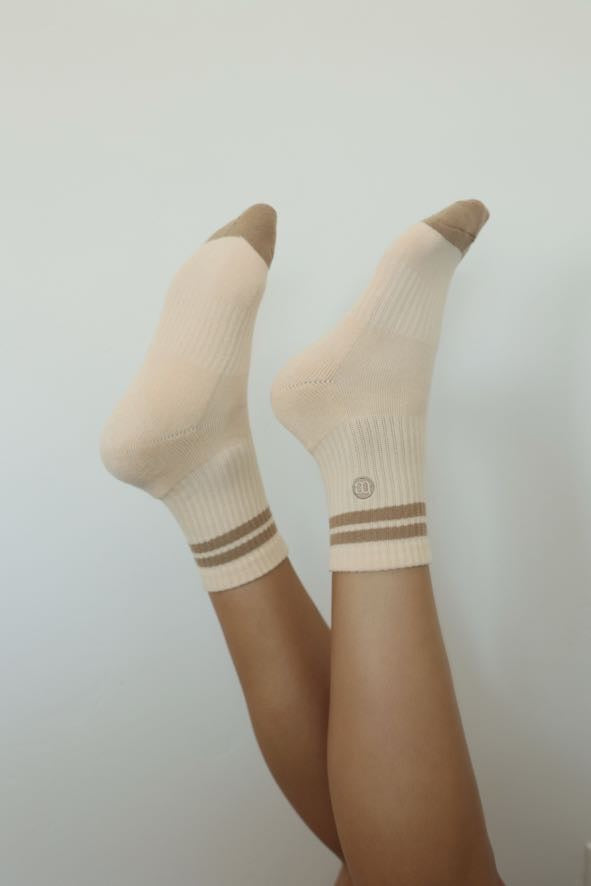 Ribbed crew socks in a soft, lightweight fabric, featuring contrast toe and heel, with double stripe detail at the cuff. Finished with a banded hem for a secure fit.