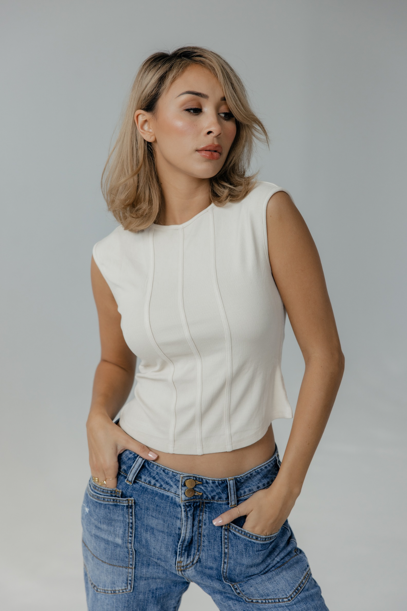 Corset top in a stretchy knit fabric, featuring a ribbed texture and vertical seam details. Designed with cap sleeves, a crew neckline, and a slightly cropped hem.