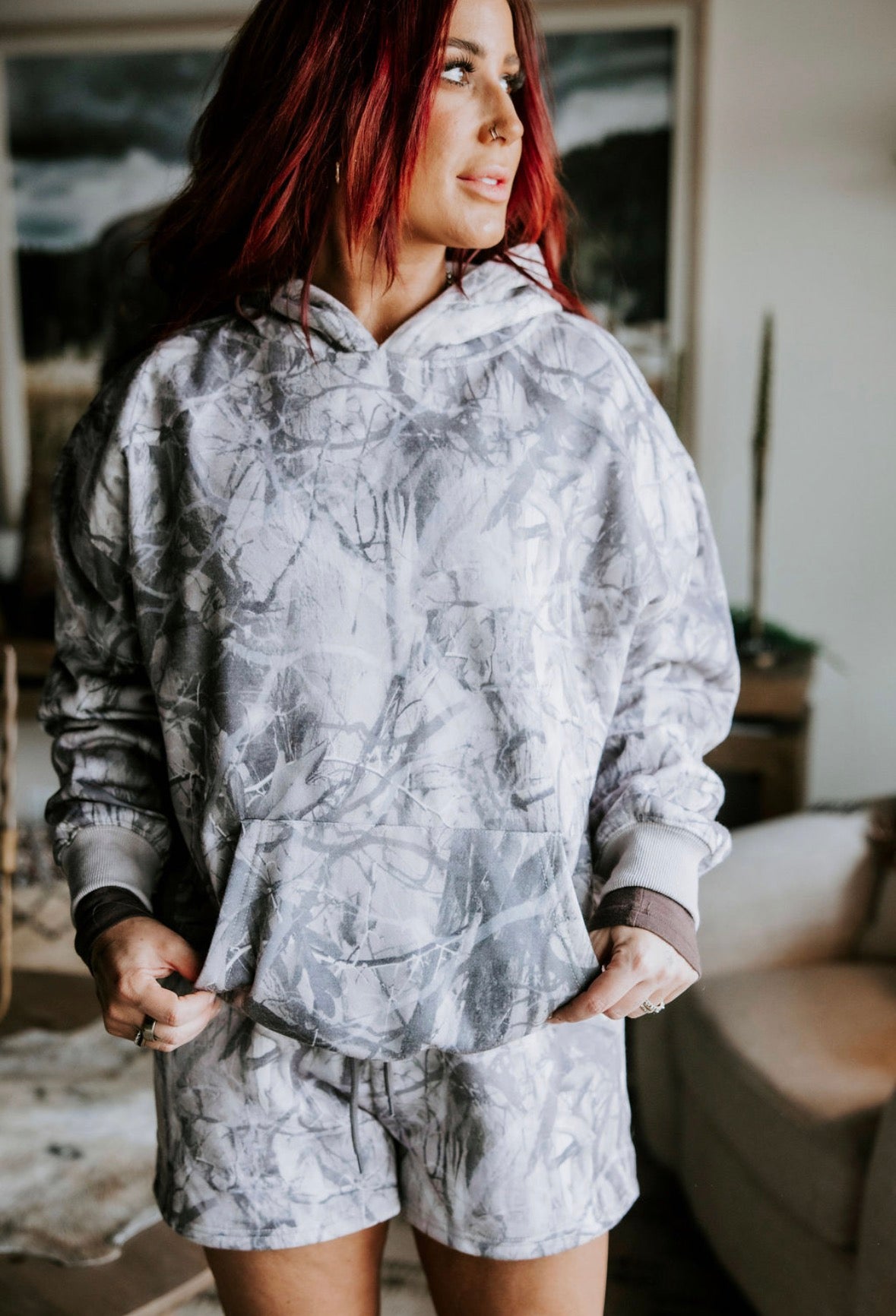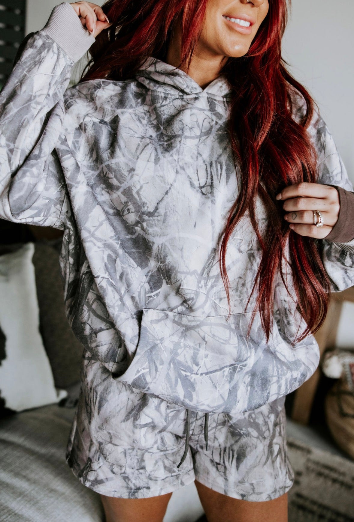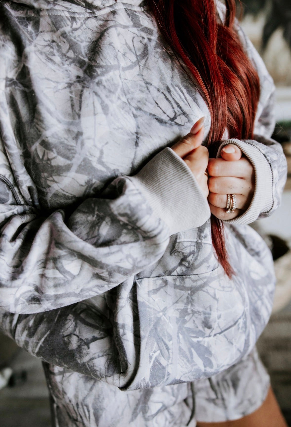 Soft fleece hoodie featuring a subtle gray-and-white camo pattern for a laid-back, lived-in look. Designed with an oversized fit, a roomy front pocket, and ribbed cuffs for extra coziness.