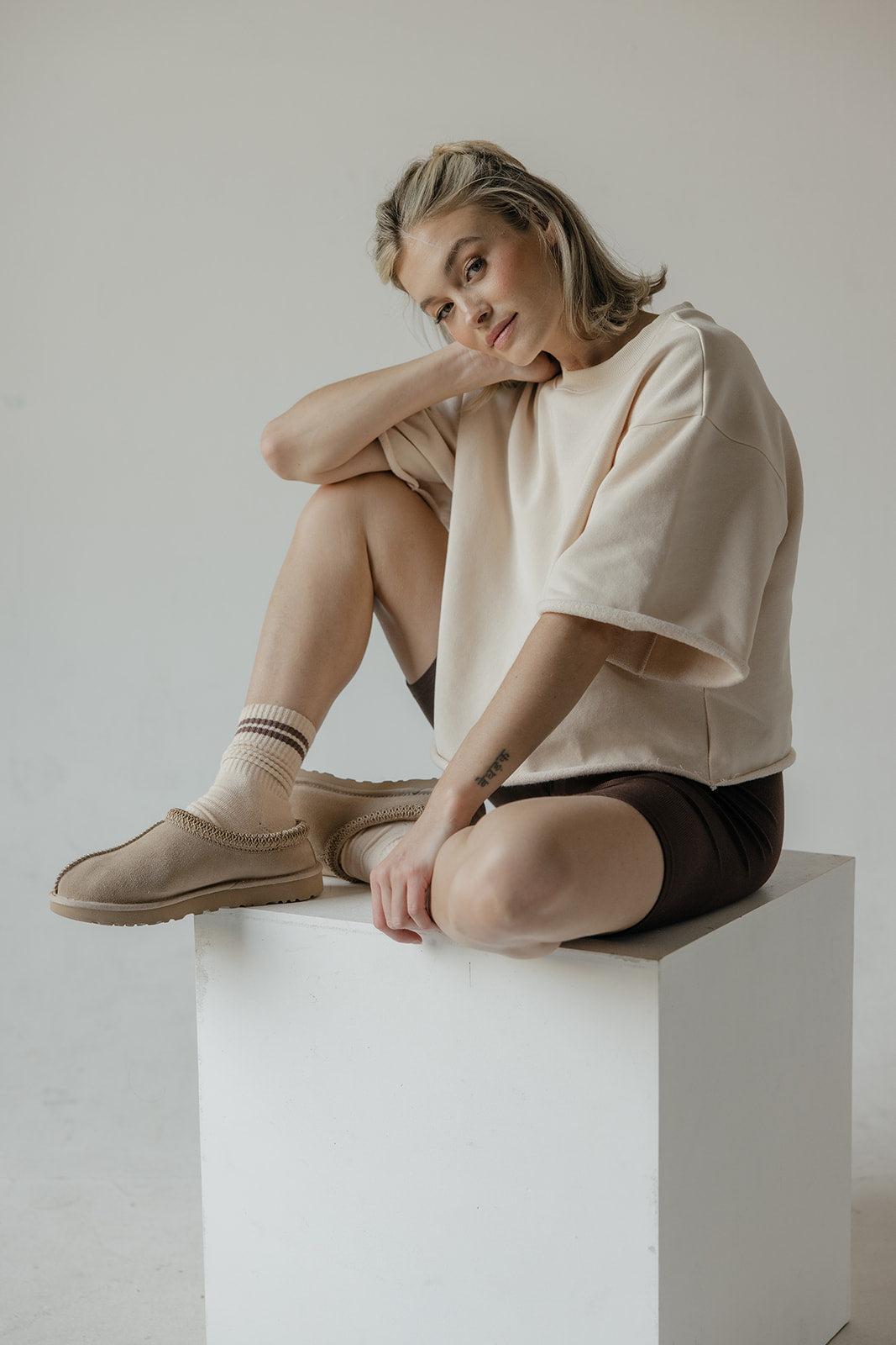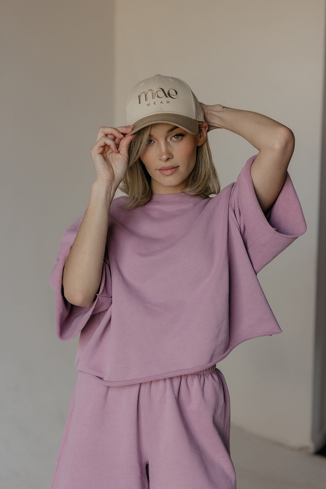 With its boxy shape and thick fleece fabric, this loose-fitting style has short wide sleeves and a cool raw hem. It’s the ultimate blend of comfort and laid-back style!