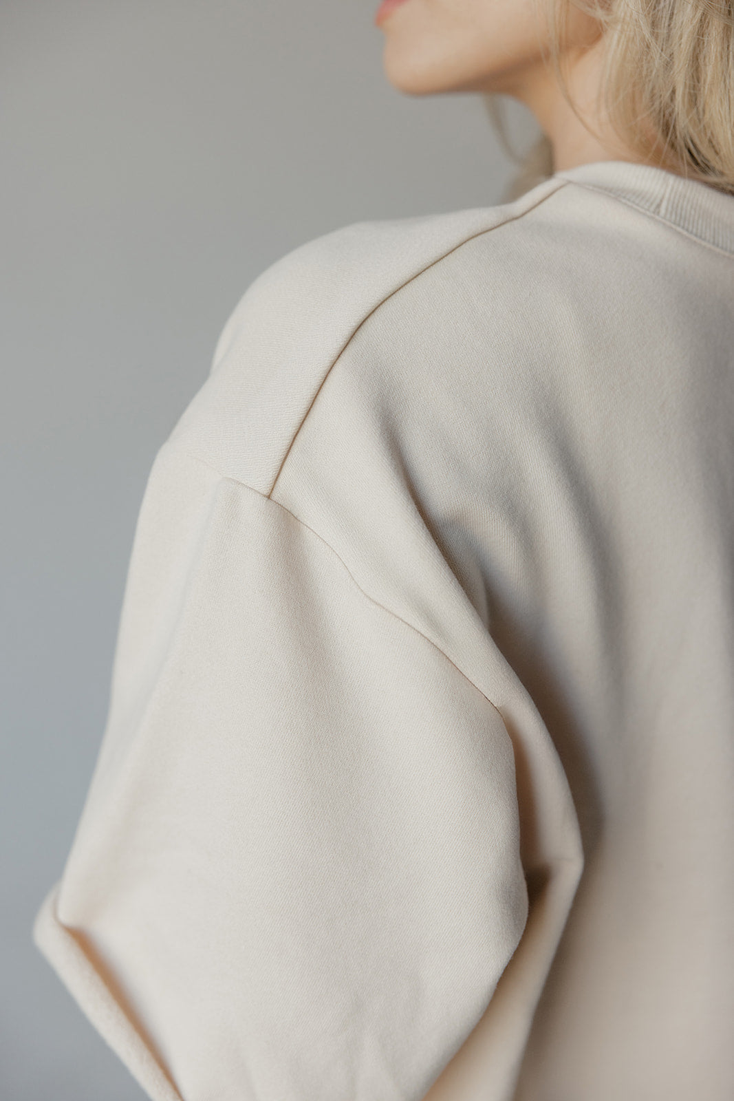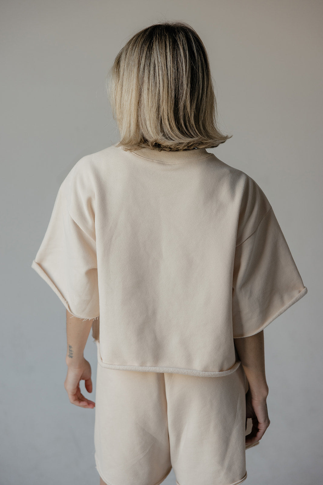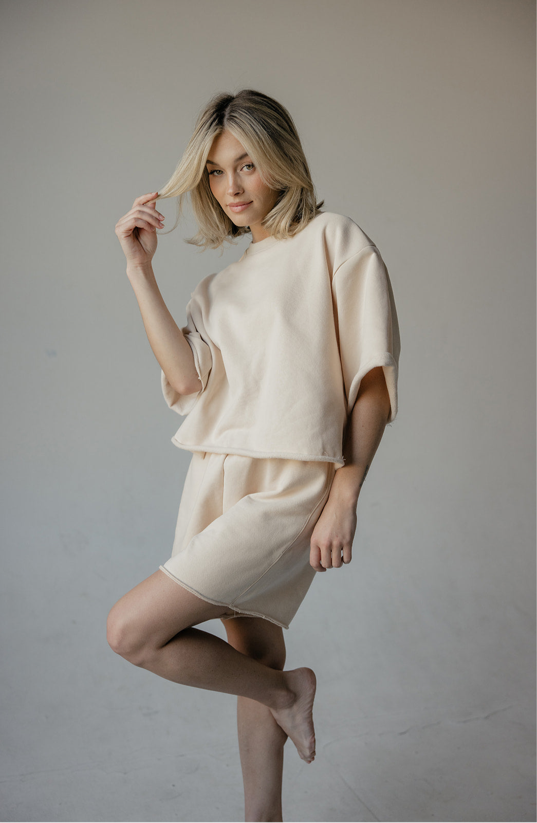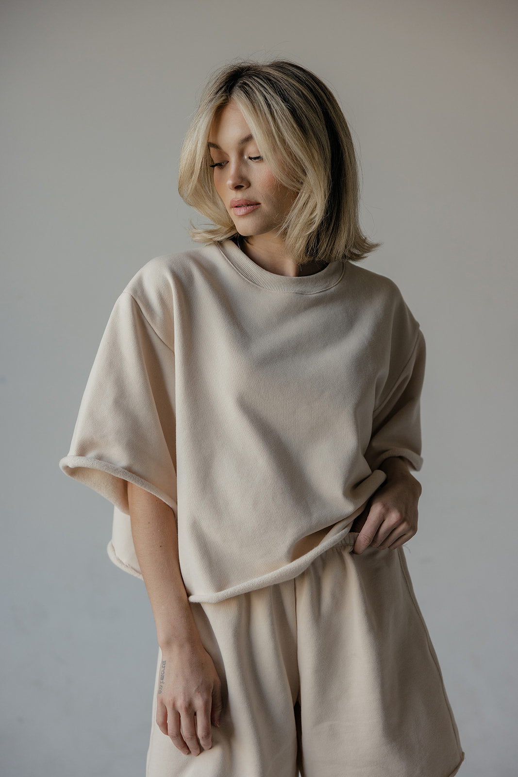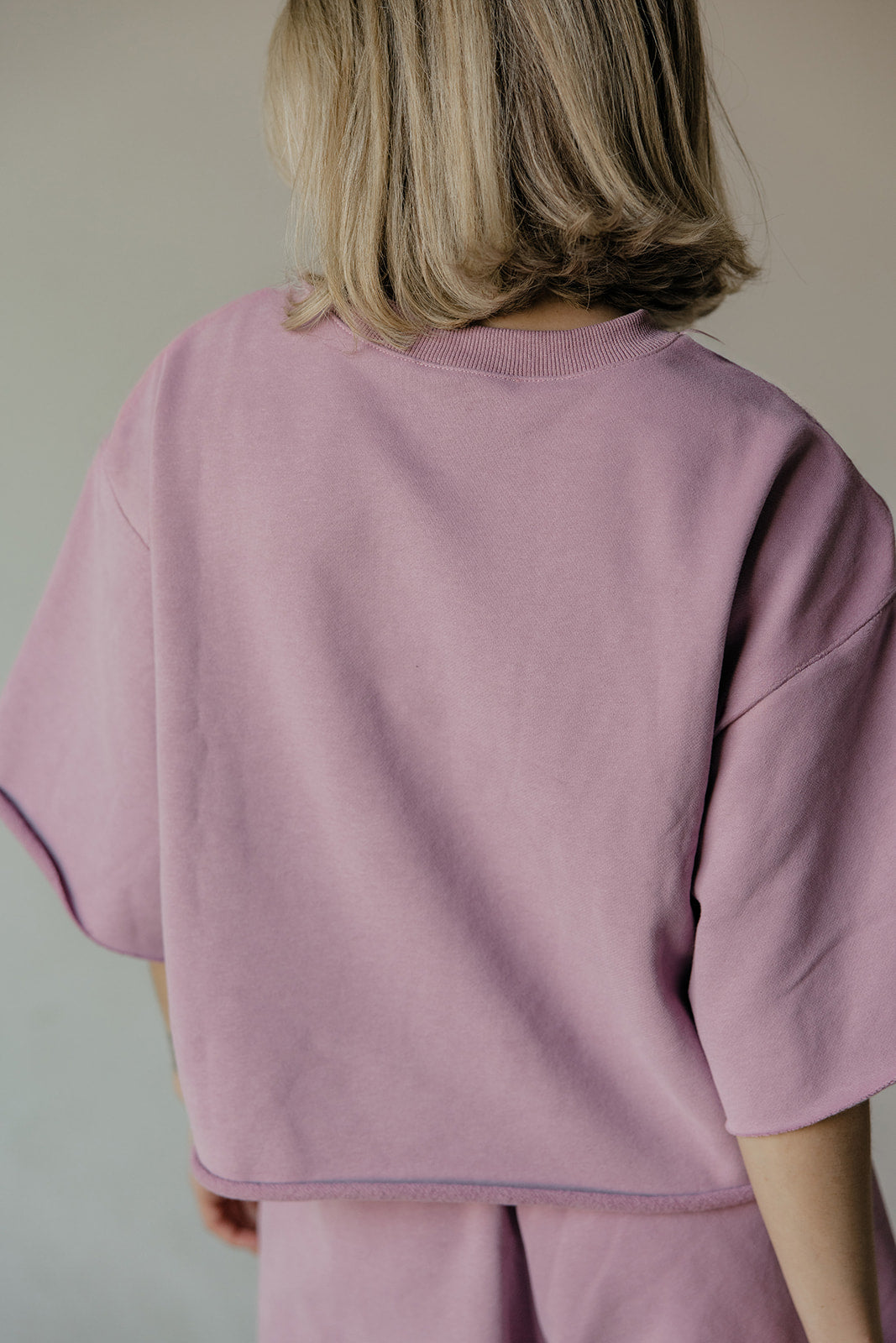 Boxy, loose-fitting sweat shirt in a thick fleece fabric, with short wide sleeves, dropped shoulders, crew neckline, and raw hem finish.